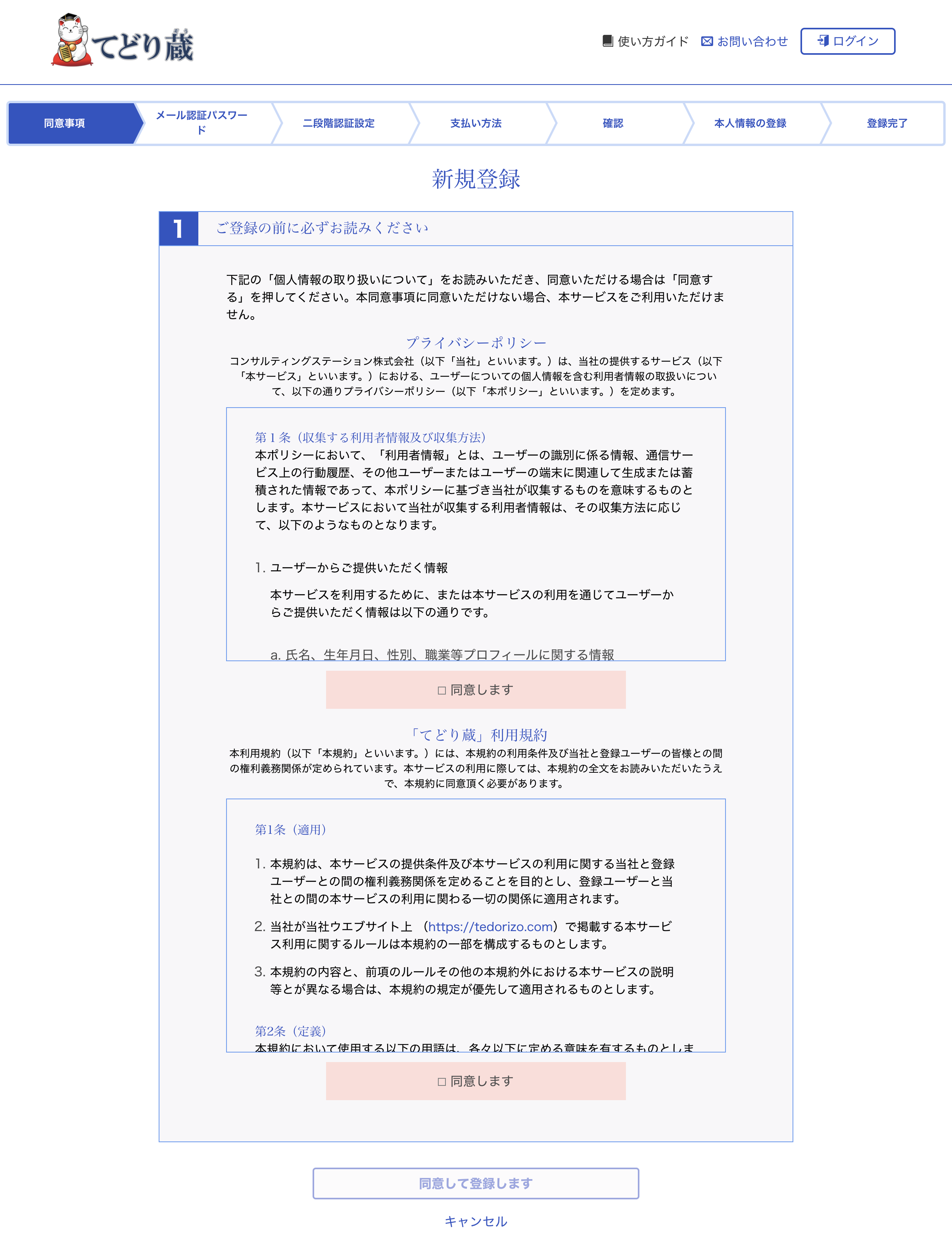 プライバシーポリシー及び「てどり蔵」利用規約をご確認の上、同意いただける場合は「同意します」のチェックを入れ「同意して登録します」をクリックしてください。
