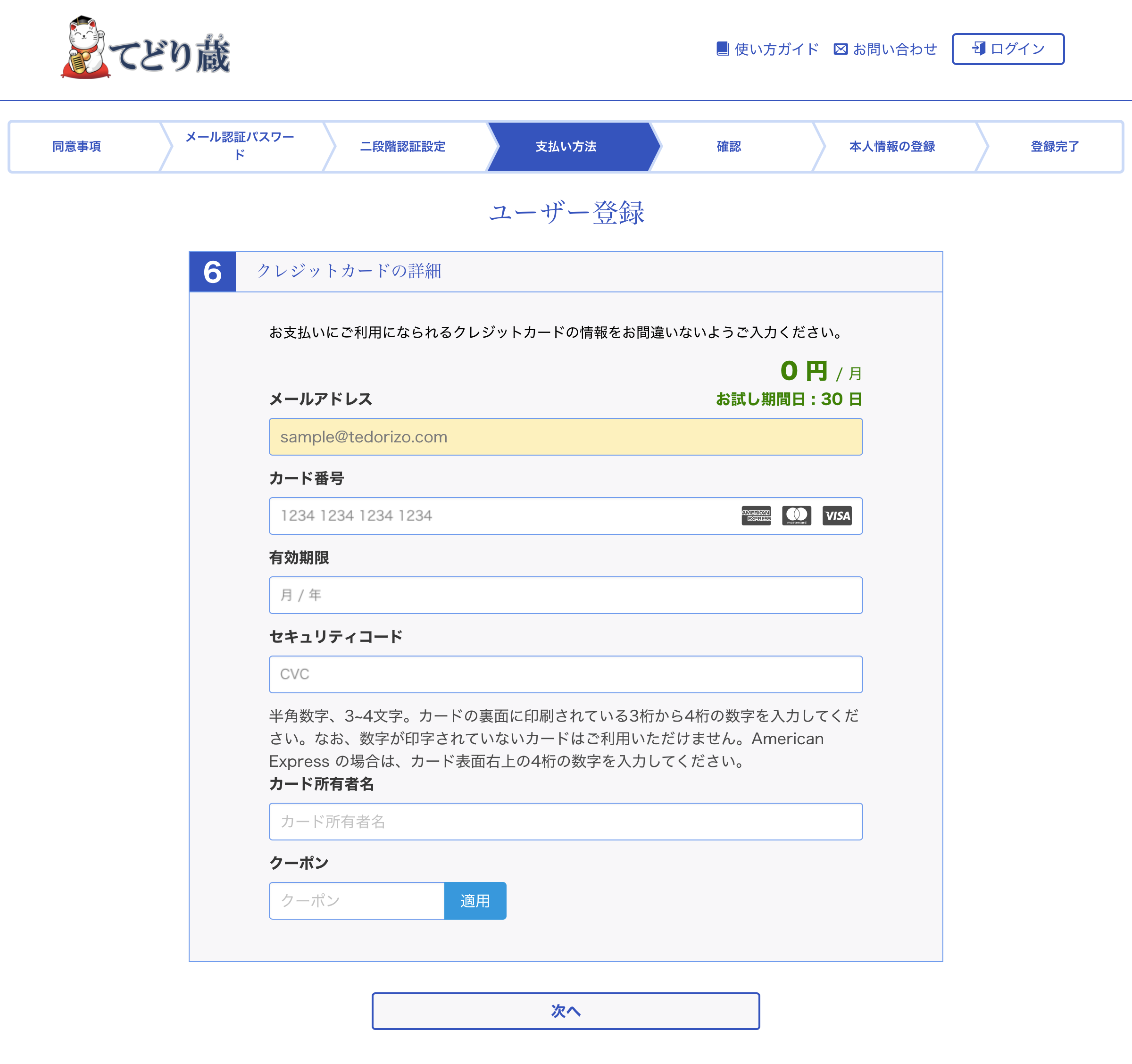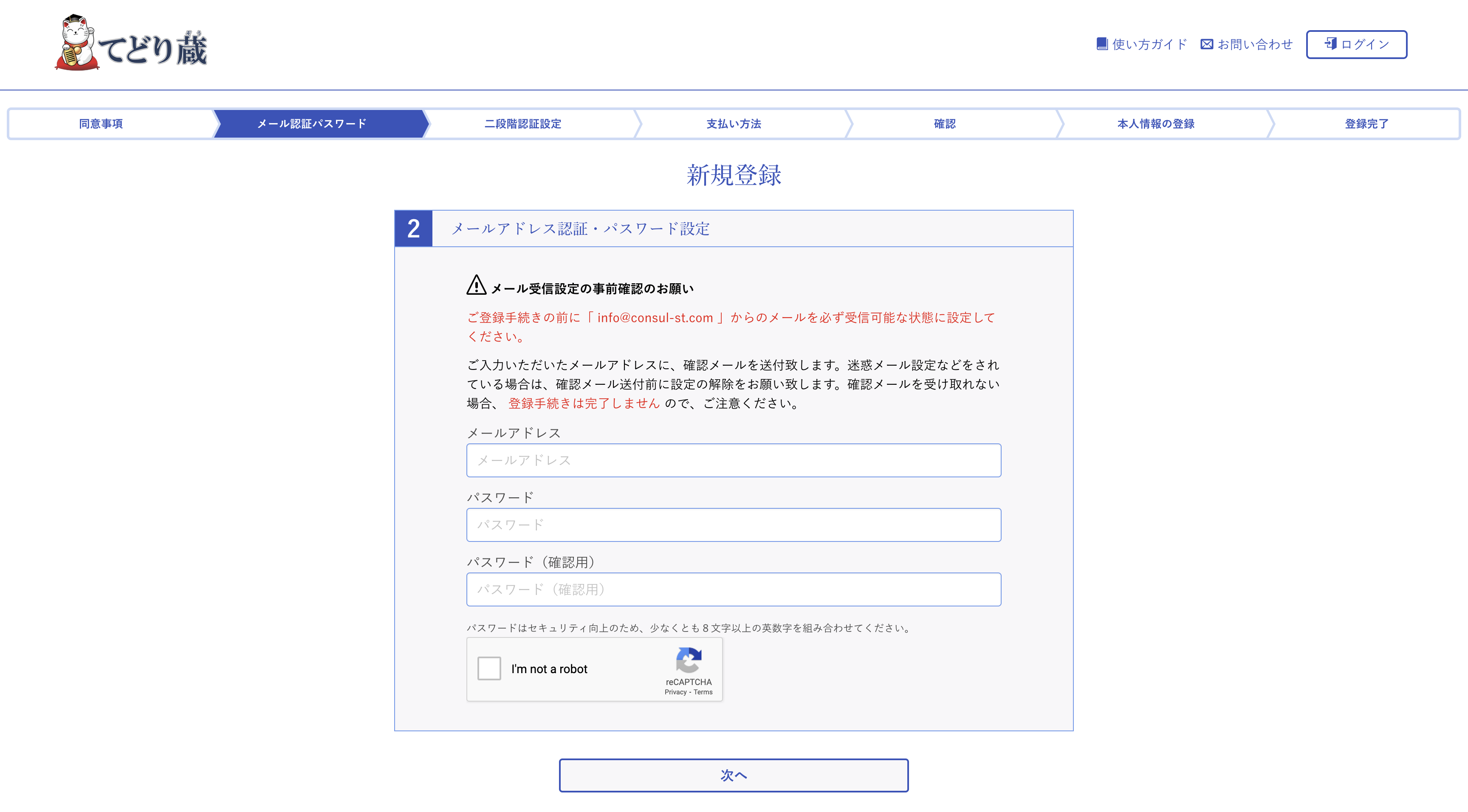 「メールアドレス」、「パスワード」、「パスワード(確認用)」を入力後、「次へ」をクリックします。