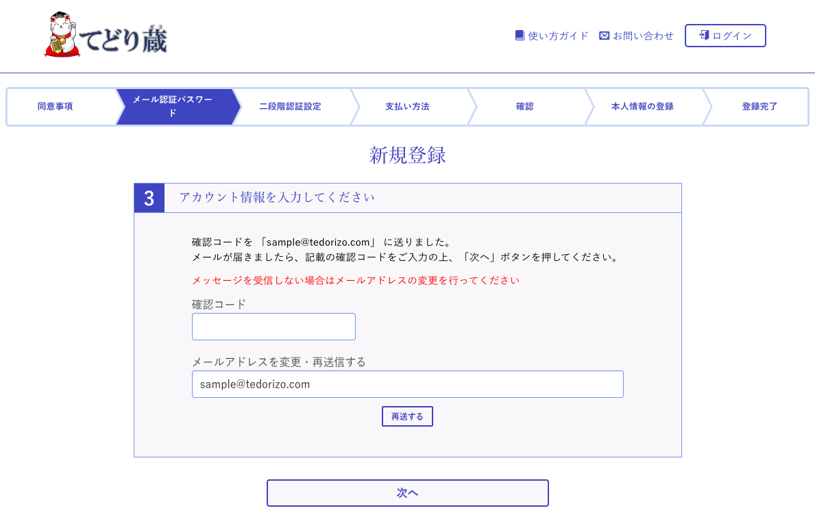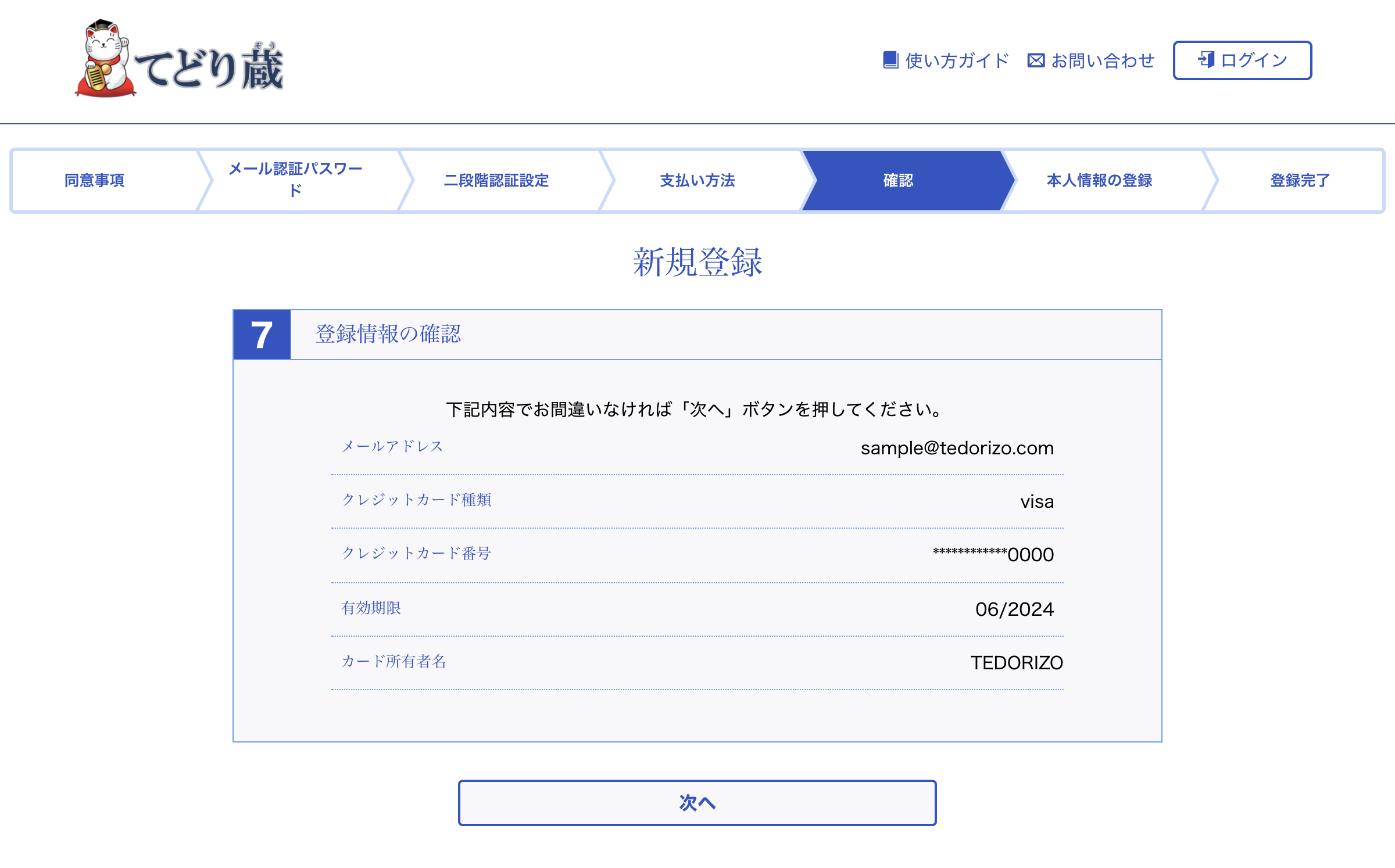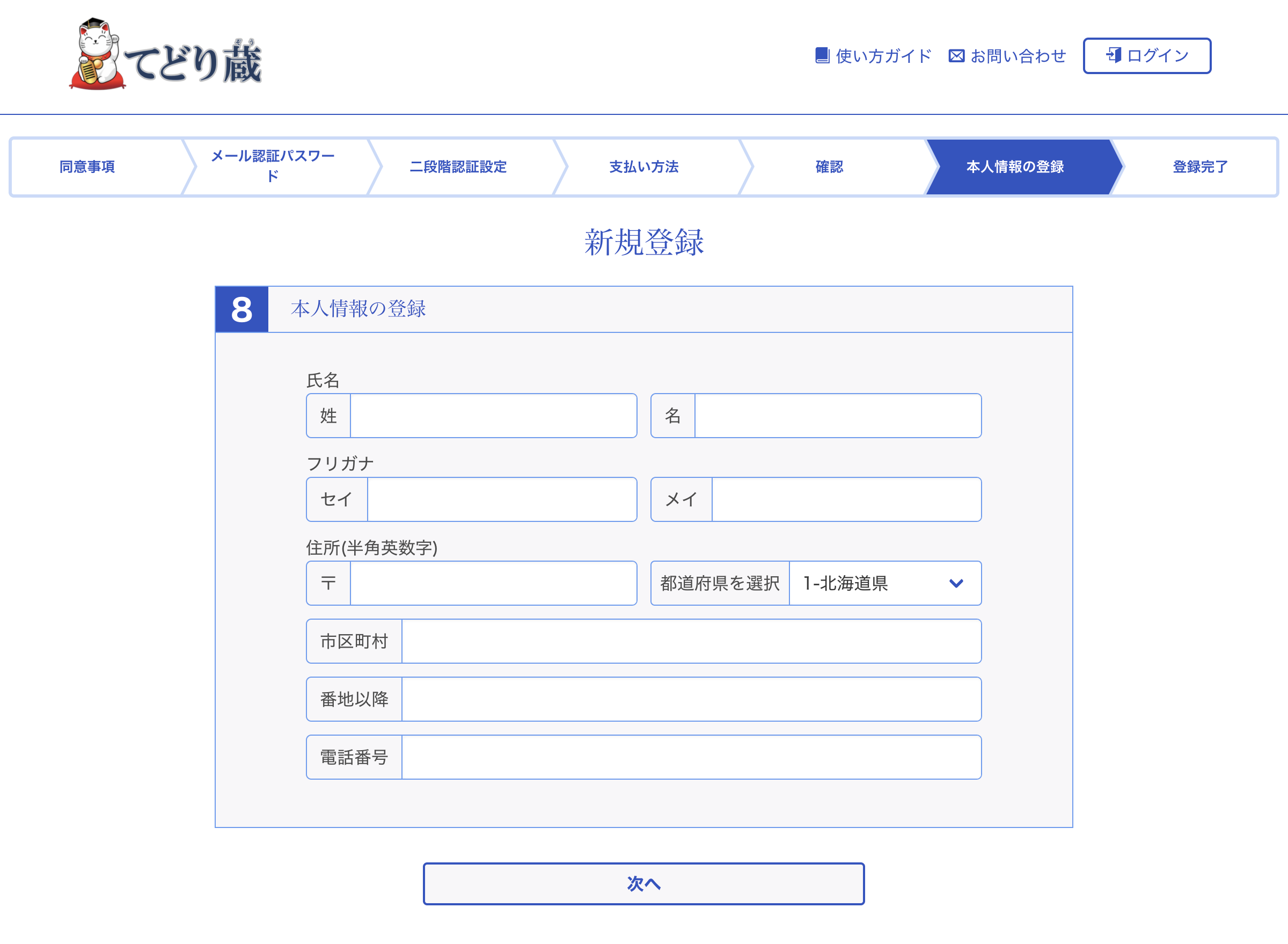 メールアドレスの認証が完了しましたら「次へ」を押して登録手続きを進めてください