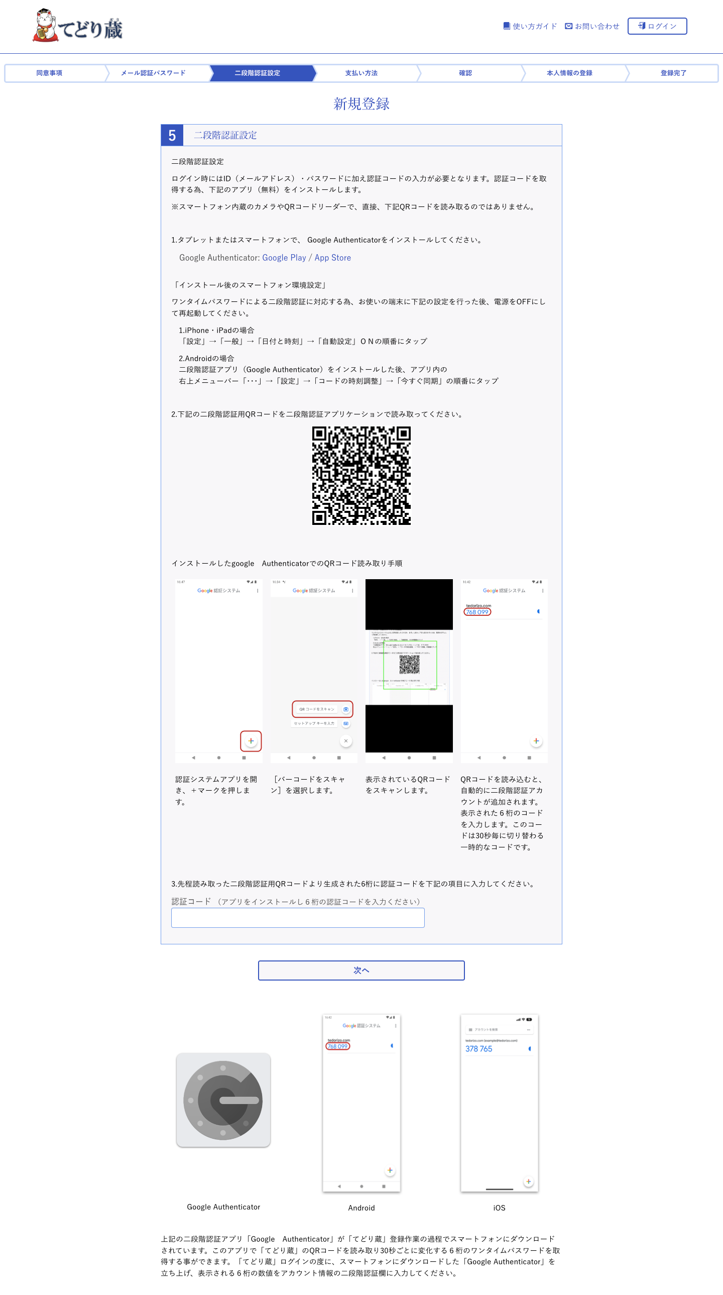 画面上に表示されているQRコードを二段階認証アプリケーションで読み取り、アプリケーション上に表示されている6桁のコードを入力して「次へ」を押してください。