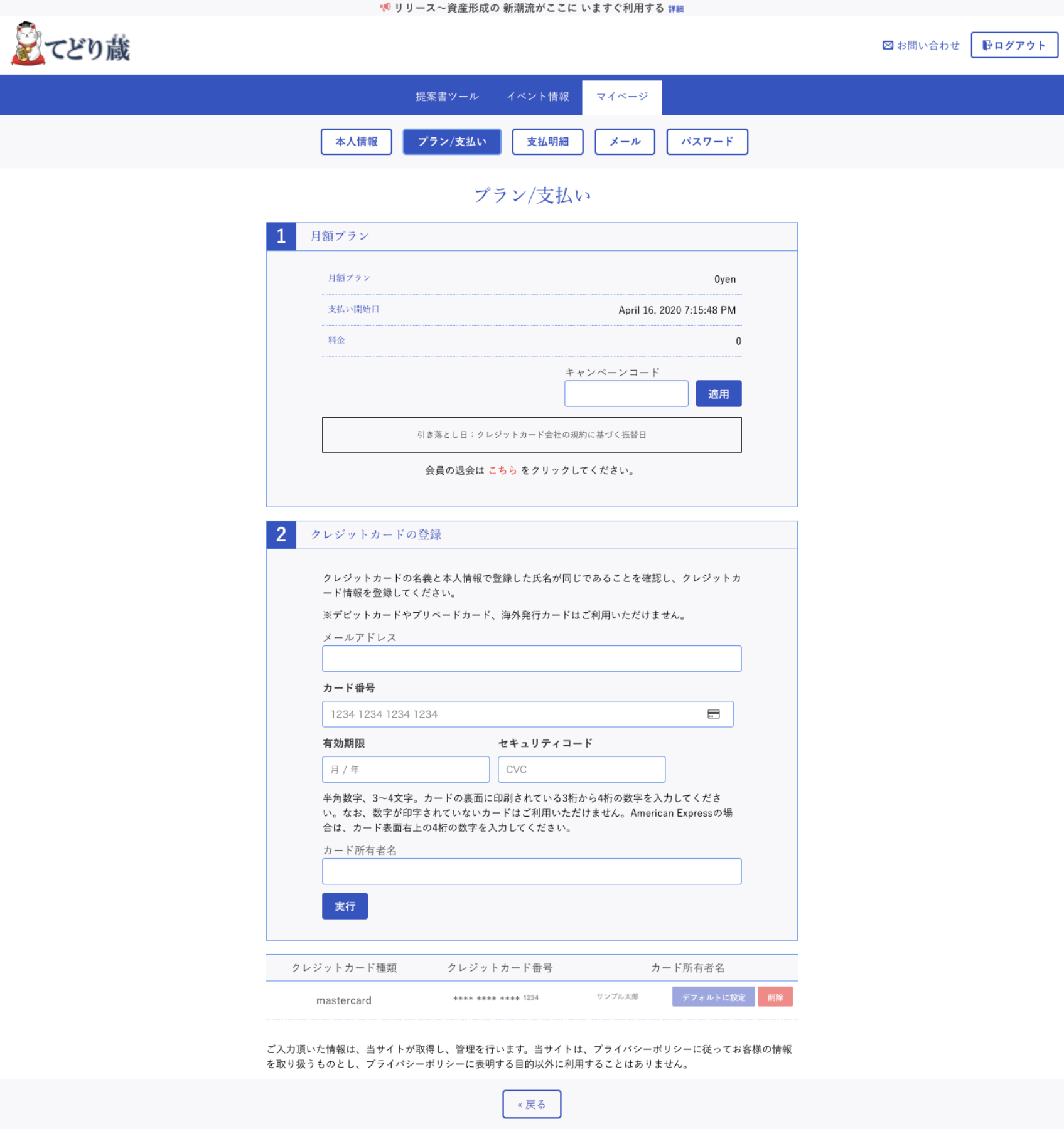 「プラン/支払い」では登録プランの確認、クレジットカードの追加、キャンペーンコードの適用できます。