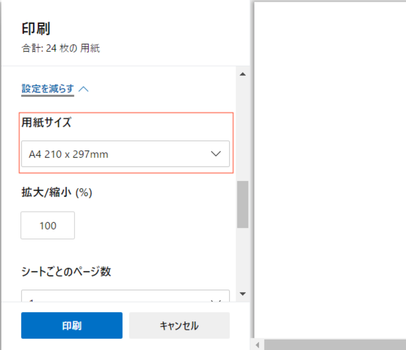 「用紙サイズ」の項目で希望の印刷用紙のサイズを選択します。