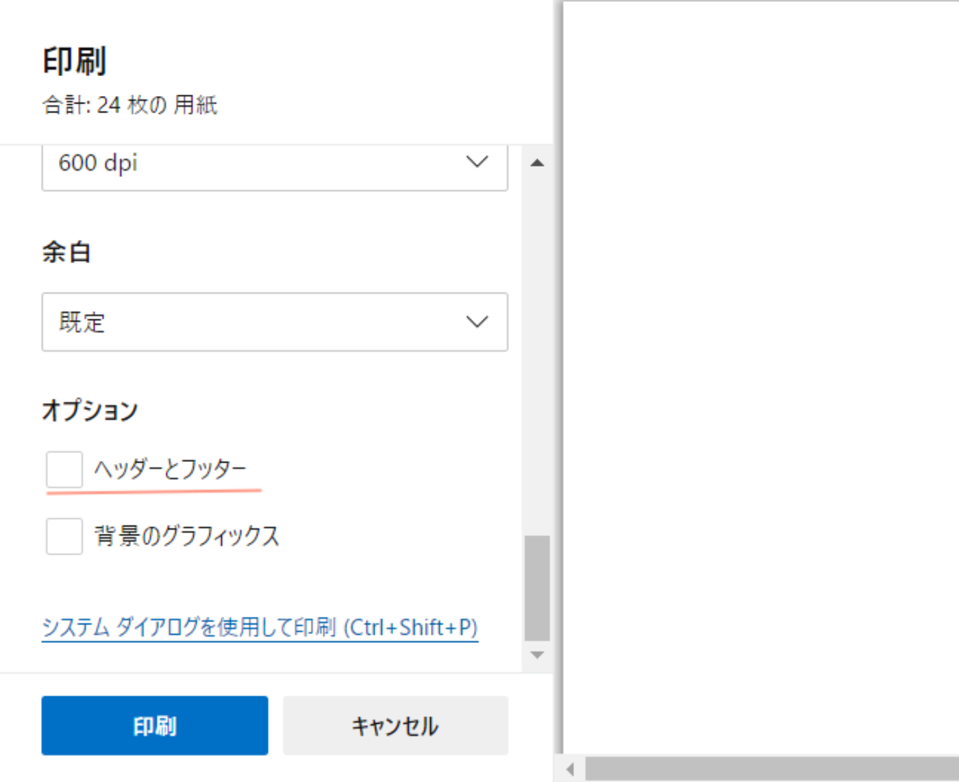 「オプション」のヘッダーとフッターを未選択にすることで、印刷する資料にURLなどを記載しないようにできます。