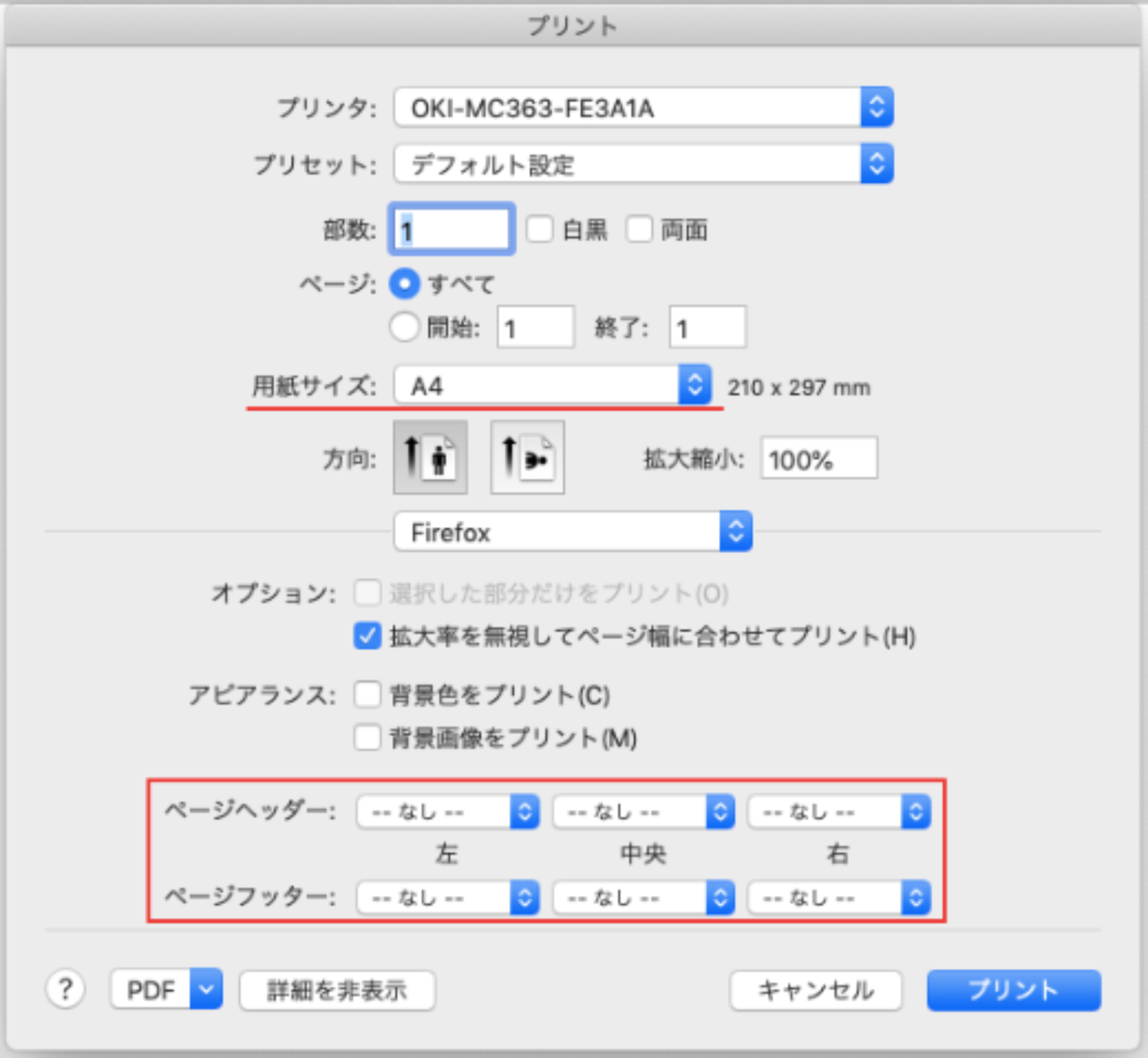 「ページヘッダー」と「ページフッター」の全項目を未選択にすることで、印刷する資料にURLなどを記載しないようにできます。