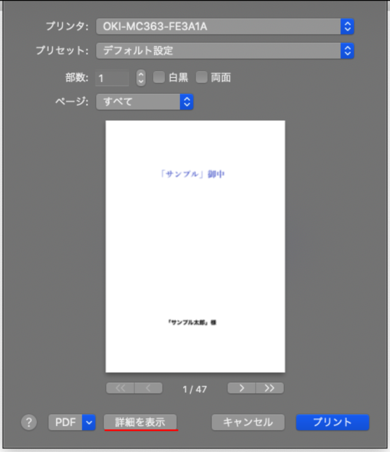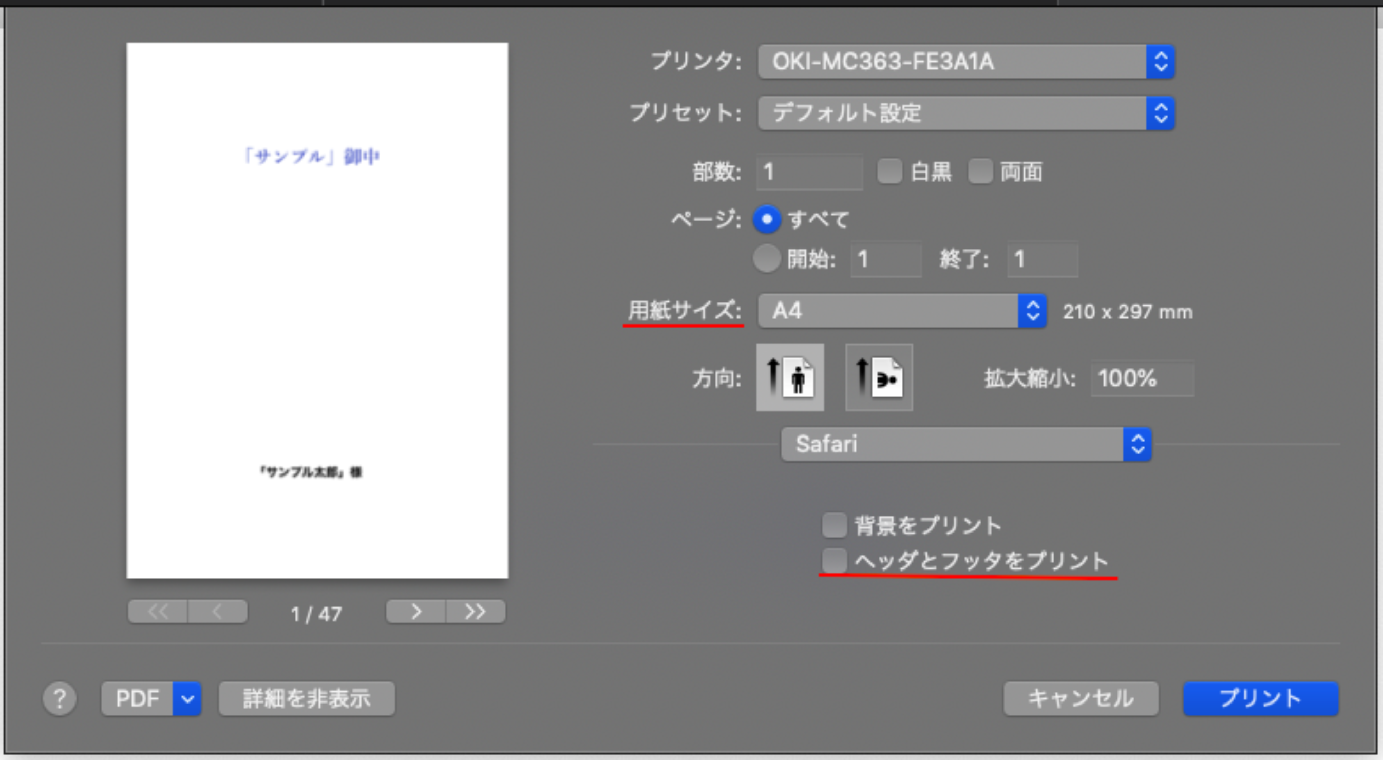 Safariの場合は、印刷画面の「詳細を表示」を選択します。