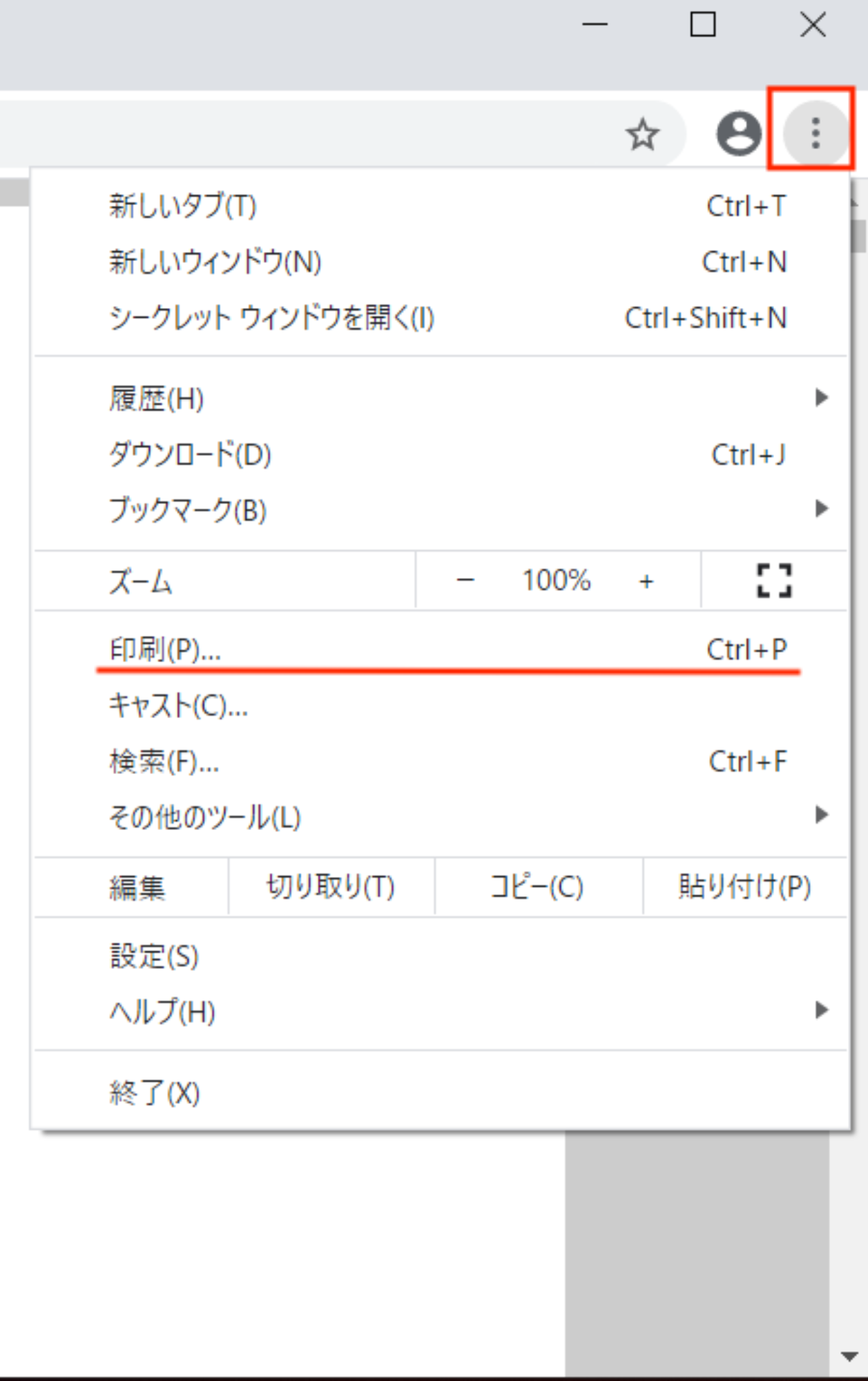 メニューアイコンの「ファイル」から「印刷」を選択するか、ctrl+Pキーを押します。