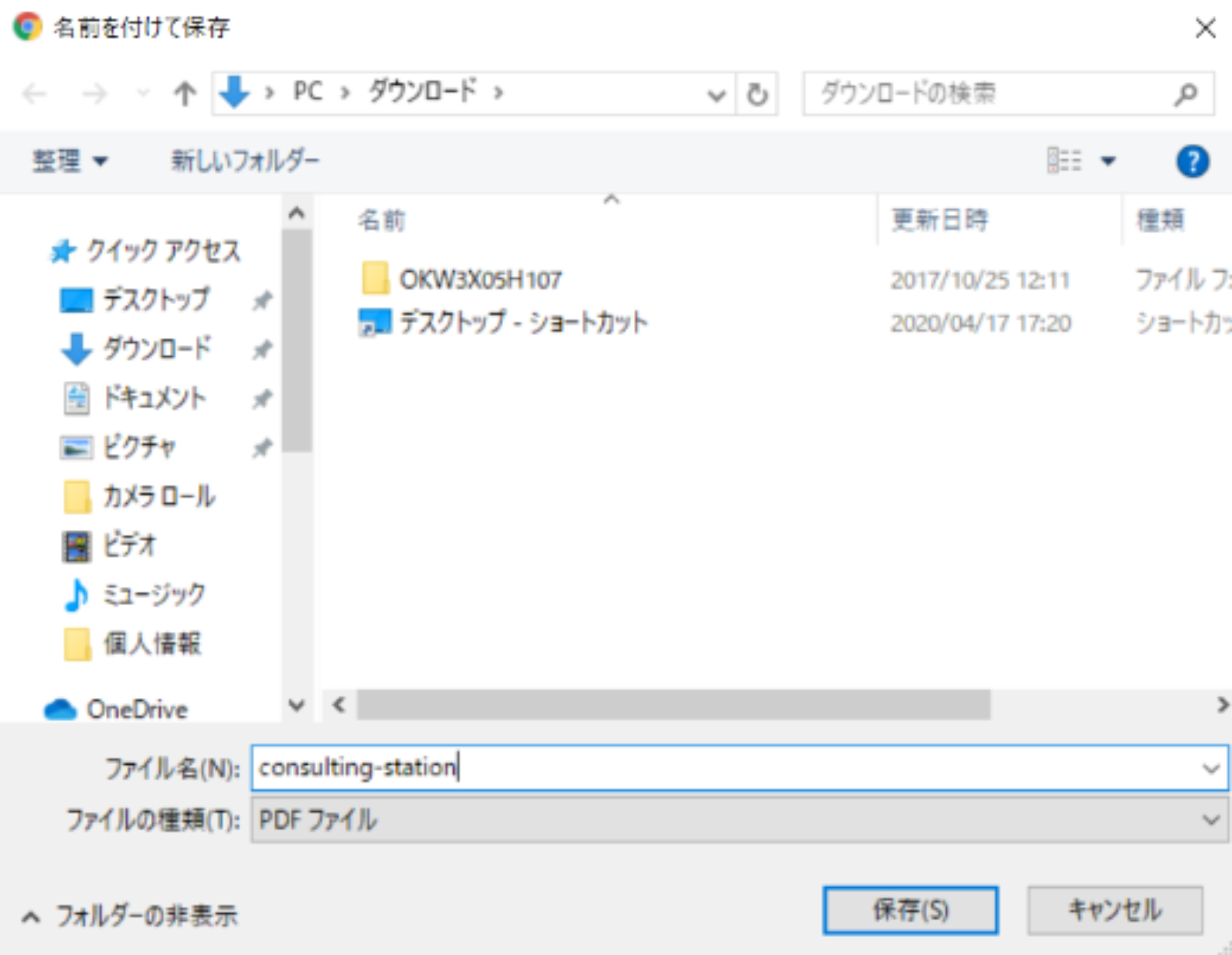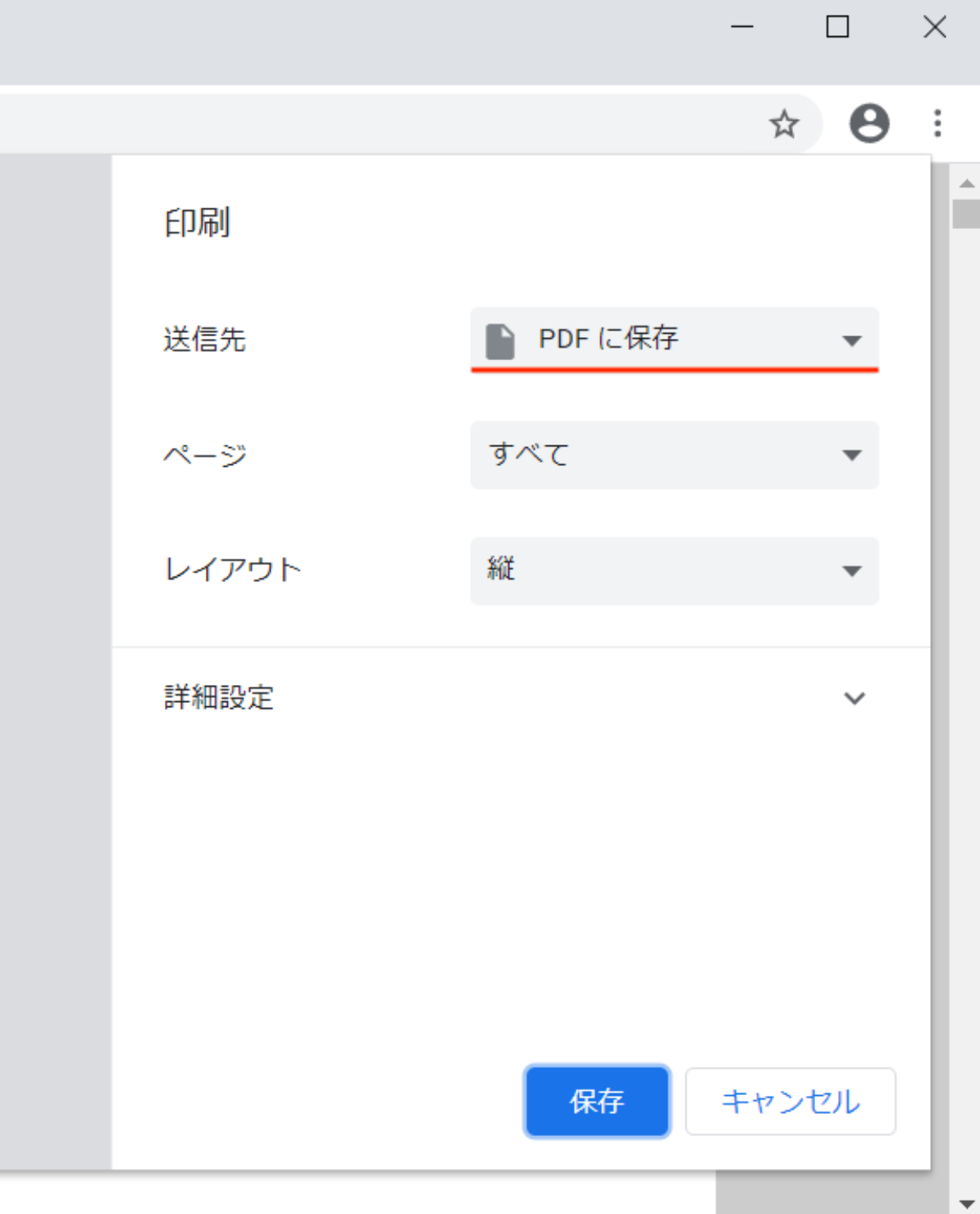 印刷画面の「プリンタ名」(または「プリンターの選択」)をPDFに保存に変更し、保存をクリックします。